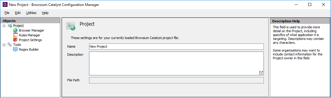 Objects Pane (Left) — Tree view enabling access to the Browser Manager, Rules Manager, and Project Settings for a given project
