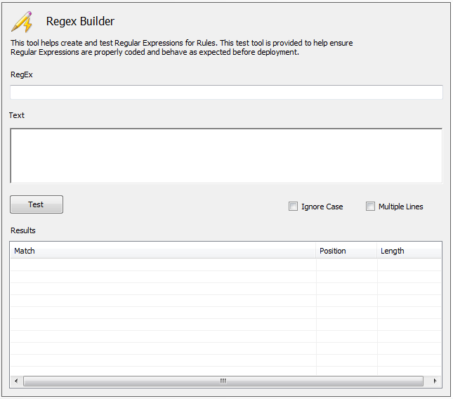 The Regex Builder provides a simple integrated tool for writing and testing Regular Expressions before using them as rules evaluation criteria to help avoid errors in pattern matching.