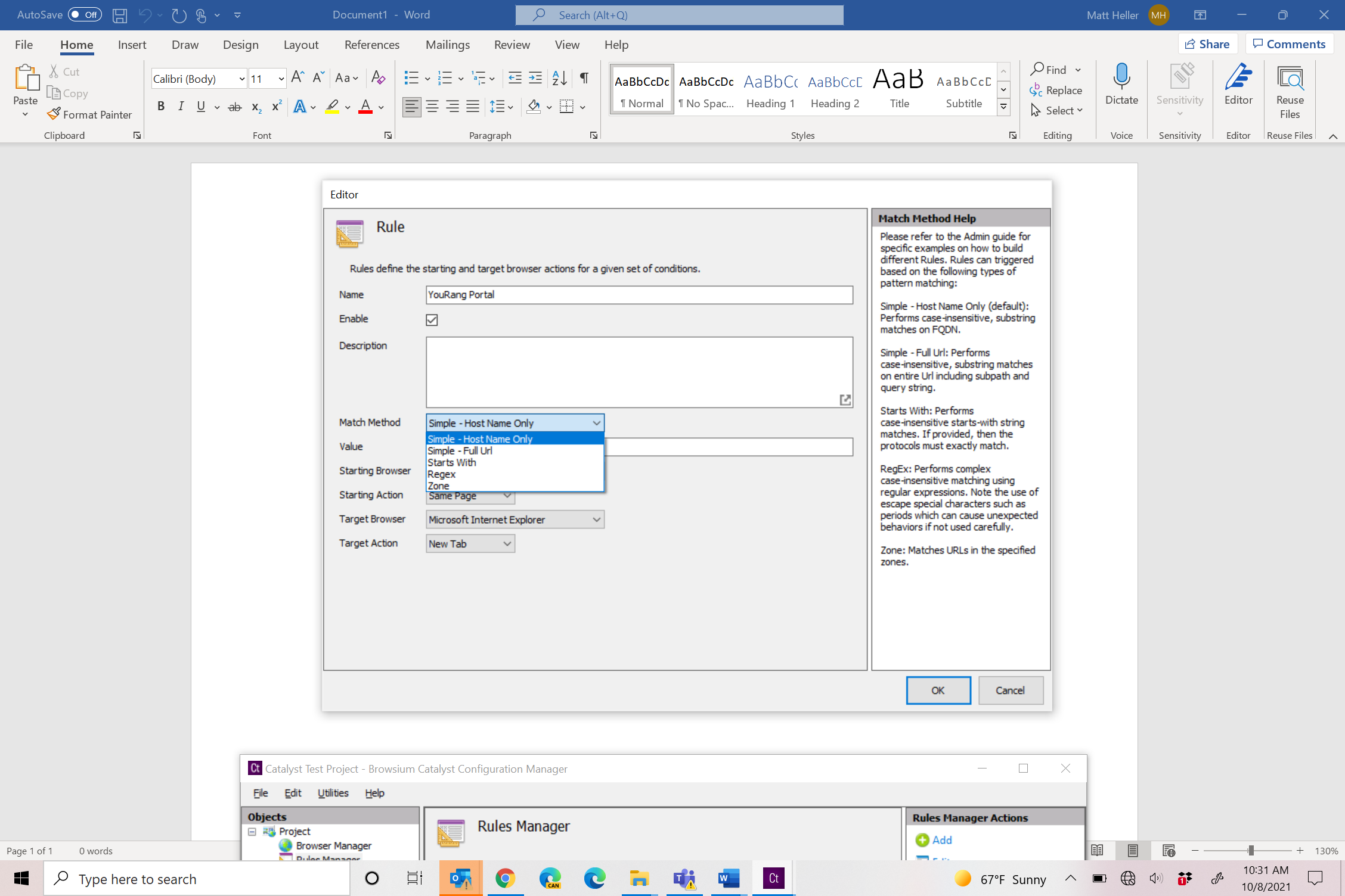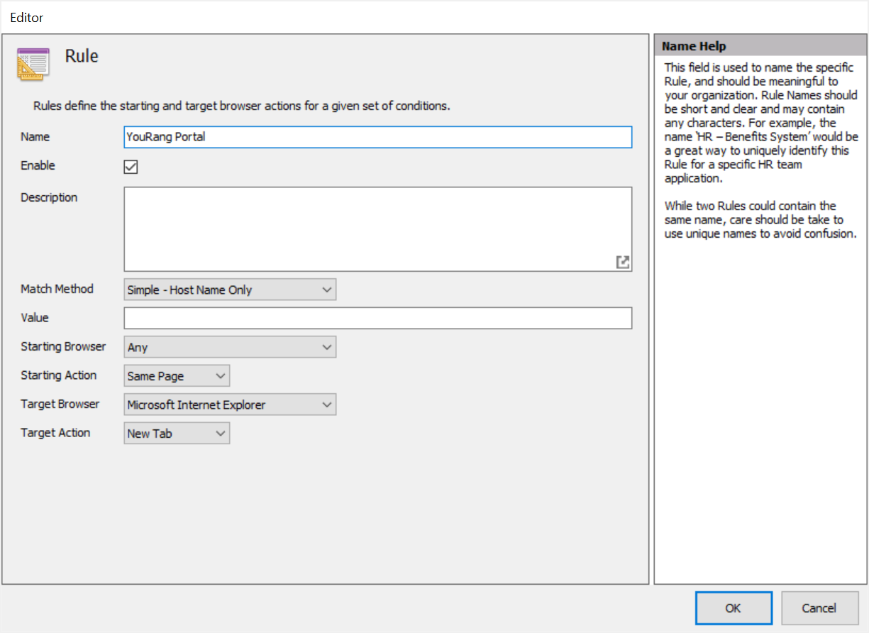 Select a Match Method from the dropdown menu. There are five Match Method options for ensuring the rule is triggered when desired conditions are met. The Simple — Host Name Only method does a simple string match of the FQDN against the text in the Value field. The Simple — Full Url method does a simple string match of the Url against the text in the Value field. The RegEx method is provided for scenarios that require a set of complex matching criteria. Zone will match the Internet Explorer Zone of the target website. Most rules will only need either the Simple — Host Name Only or Simple — Full Url methods. For this example, we will leave everything set to the default (Simple — Host Name Only).