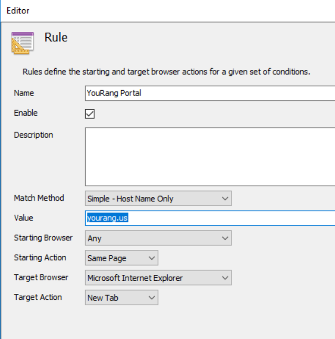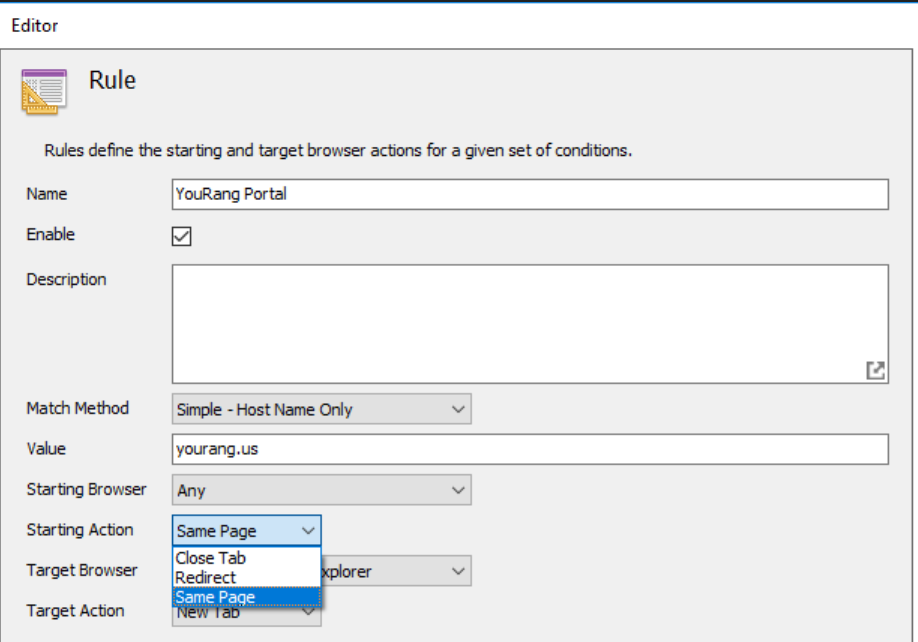- The ‘Target Browser’ setting defines which browser is loaded when the rule conditions are met. By default, this value is set to the Default Browser value listed in the Project Settings node — in this case ‘Edge IE Mode’. Administrators should set this value to the desired browser. If the purpose of the rule is to block navigation (e.g. for security purposes), simply set the value to ‘NONE’. For this example, we will load the YouRang portal in Edge Internet Explorer Mode.