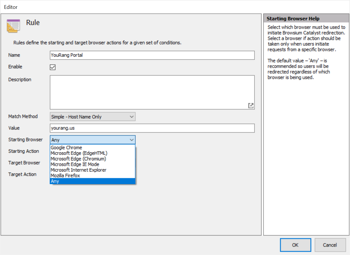 - The ‘Starting Browser’ option allows administrators to define if the user must initiate a rule action from a specific browser, or if the rule should be triggered regardless of which browser is active at the time. The default value for this setting is ‘ANY’ to ensure the broadest rule coverage.