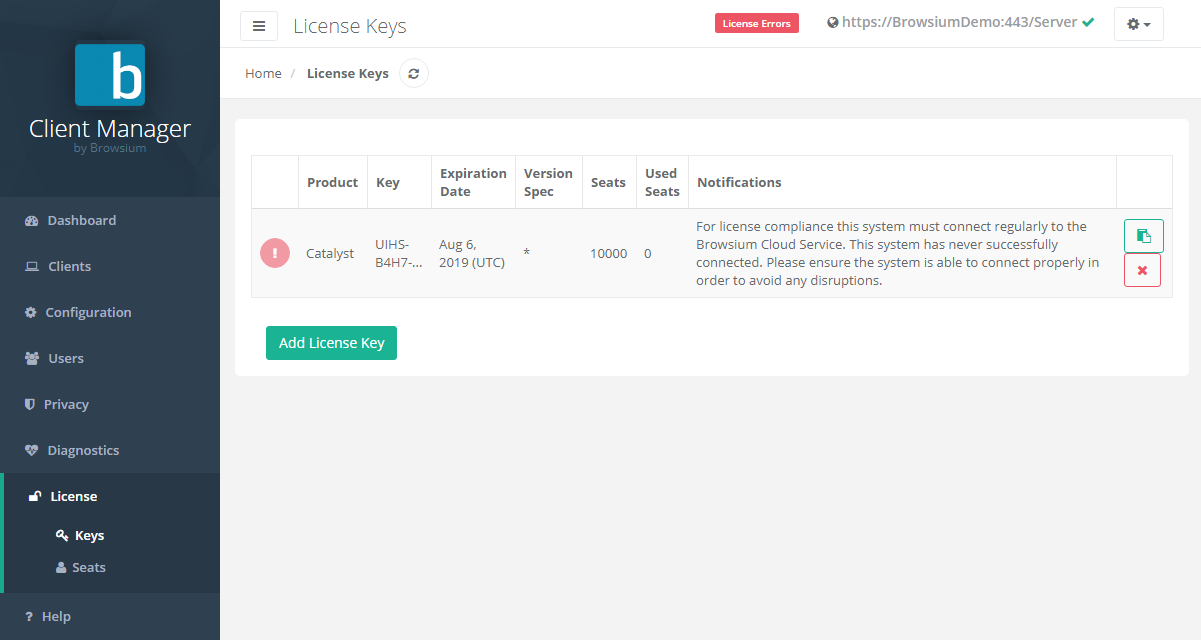 To add licenses, see section 4.3. If there is reason to remove a license key, simply click the red ‘X’. To copy your license key to the clipboard, click the green logo.