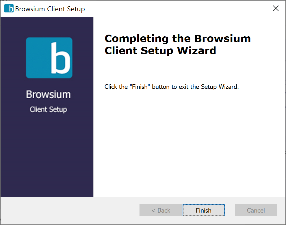 - The following screen will display to indicate success when the Browsium Client installation process has finished.