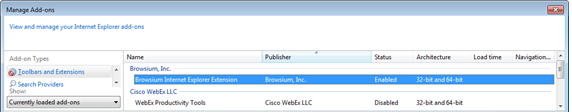 Section titled “Confirming Browser Extension Installation”To confirm the Browsium Client installation has completed properly, launch Internet Explorer and select Tools->Manage Add-ons and ensure the Browsium Internet Explorer Extension is listed and Status is set to Enabled.
