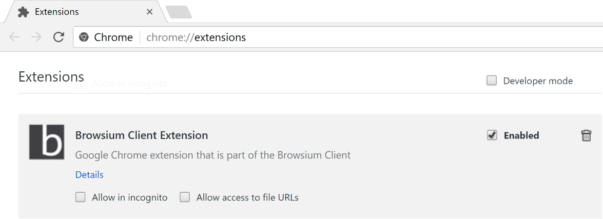 To confirm the Browsium Client installation has completed properly for Google Chrome, launch it, and open the Settings menu. Select the More Tools / Extensions menu item and verify the Browsium Client Extension is installed and the Enabled checkbox is set. You may also enter chrome://extensions in the address bar to navigate directly to the Extensions page.