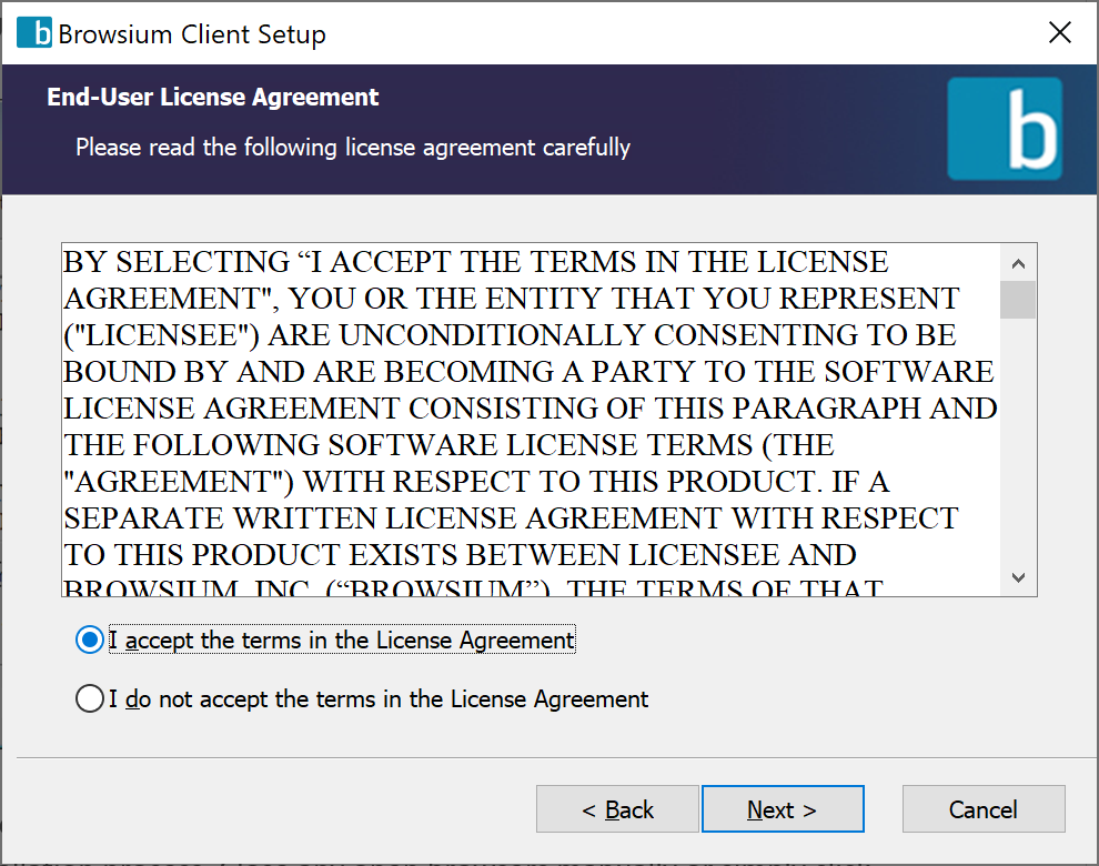 The next screen contains the End User License Agreement (EULA) for Browsium software. Read and accept the terms of the EULA in order to proceed, then click Next.\