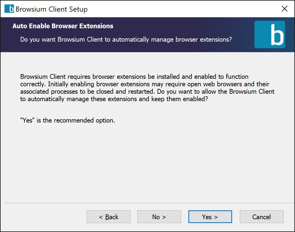 Click Yes to allow the Browsium Client to enable the extensions and retain control over the setting once deployed. Selecting No only installs the browser extensions, the Browsium Client extensions will not be automatically enabled or setup for ongoing management. Clicking either the Yes or No options will require all open browser windows be closed, and the installer will close them automatically.