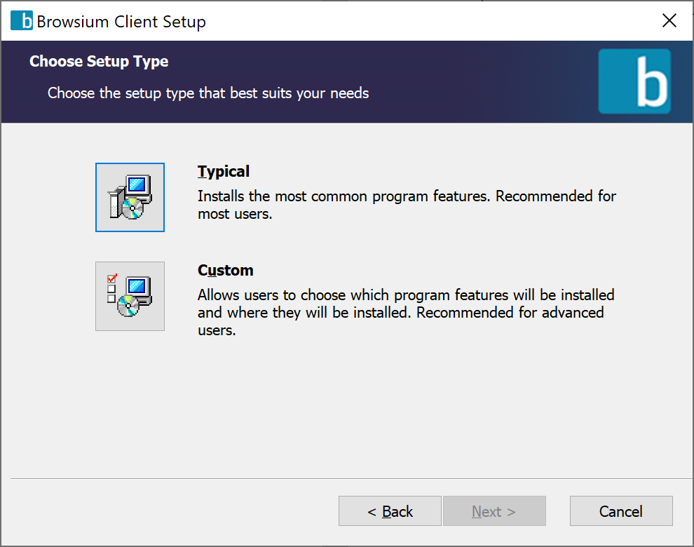 - Selecting Typical installs the Browsium Client Extensions for Microsoft Internet Explorer, Microsoft Edge, Google Chrome, and Mozilla Firefox, and installs the software in the default Program Files directory for 32-bit applications — ‘Program Files’ on 32-bit systems and ‘Program Files (x86)’ on 64-bit systems. If you don’t need to change these defaults, select Typical, then Next to proceed with the Browsium Client installation.